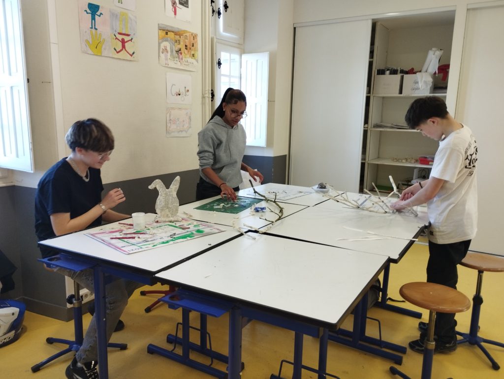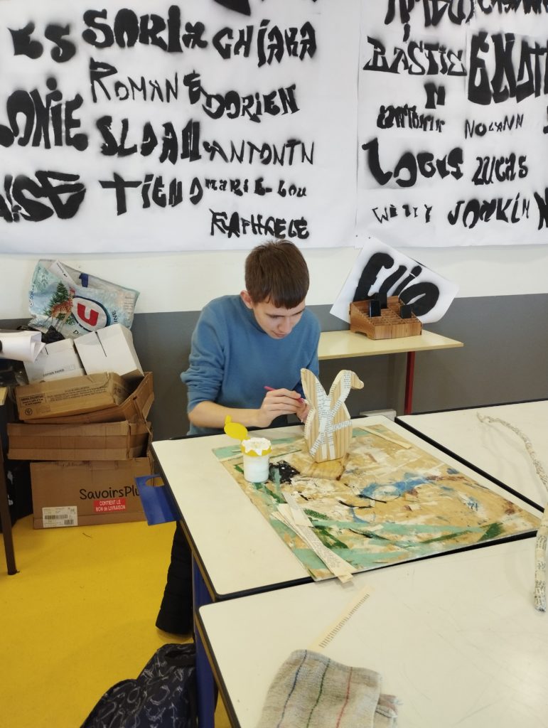 Les décorations ont été préparées en arts appliqués avec Mélanie Touraine. Ils se sont appliqués à préparer des branchages entourés de bandes de papier et bien sûr des œufs et des lapins sur le thème de Pâques.