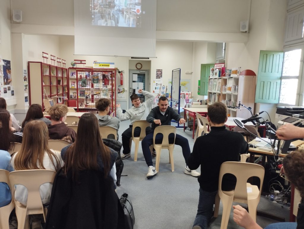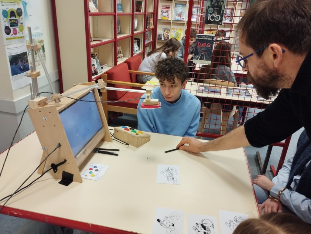 Le second atelier était consacré au bruitage. Les élèves ont utilisé leur voix ou des petits objets amenés par Simon Astié pour recréer différents sons : moteurs, accélérations ou chutes. Le réalisateur, grâce à sa maitrise technique, a ensuite pu synchroniser leurs bruitages avec l’extrait vidéo de la chute de vélo de Buster Keaton, un exercice à la fois ludique et exigeant.